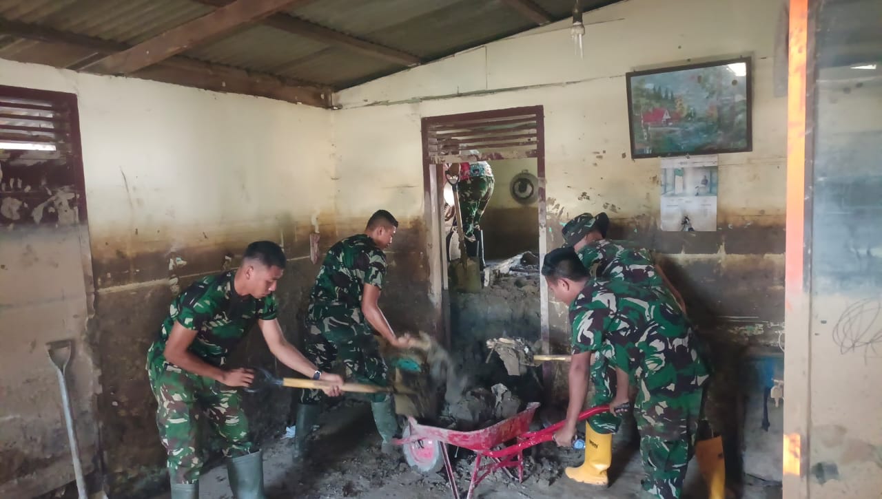 Di lapangan, terlihat para prajurit tetap bekerja penuh dedikasi sejak pagi hingga sore hari. Dengan peralatan sederhana, mereka bersama warga saling bahu-membahu membersihkan sisa lumpur dan sampah yang masih mengendap di dalam rumah.