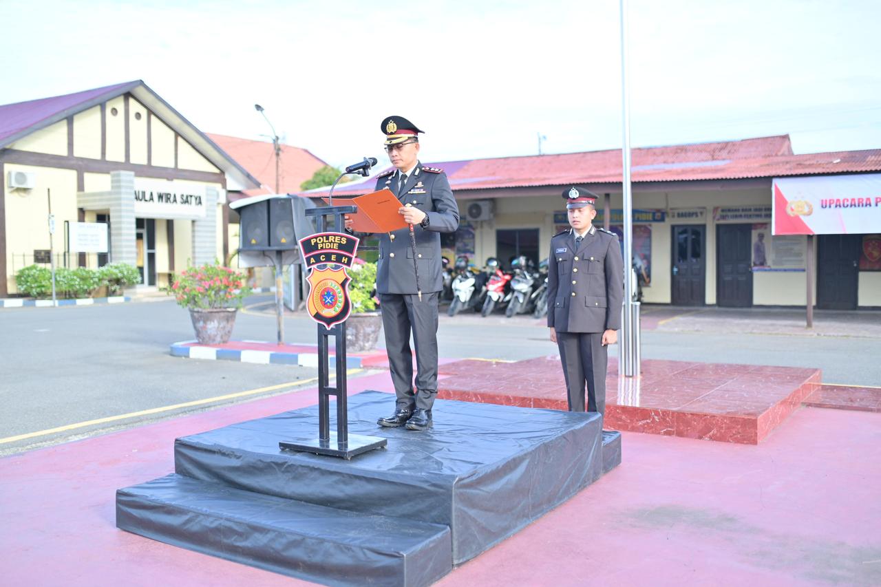 Upacara yang berlangsung khidmat tersebut dipimpin langsung oleh Kapolres Pidie AKBP Jaka Mulyana, SIK, MIK dan diikuti para pejabat utama, perwira, serta seluruh personel Polres Pidie.