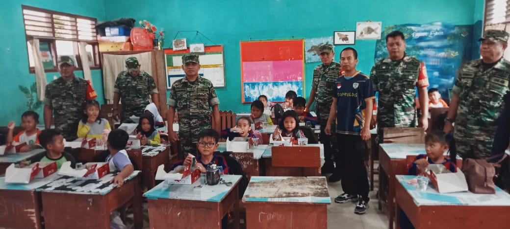 Danramil 431-02/Mentok Mayor Czi Maharuddin dalam kesempatan tersebut menyampaikan bahwa kegiatan Makan Bergizi Gratis merupakan bentuk nyata kepedulian TNI terhadap generasi penerus bangsa.