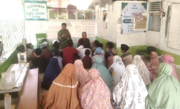 Sabang,Aceh – Dalam rangka membina generasi muda yang berakhlak dan disiplin, Babinsa 08 Gampong Kuta Ateuh Koramil 02/Sukakarya Kodim 0112/Sabang, Pelda Syafrial, melaksanakan komunikasi sosial (komsos) bersama anak-anak pengajian di Taman Pengajian Al-Qur’an (TPA) Babul Jannah, Jurong Sutedjo, Gampong Kuta Ateuh, Kecamatan Sukakarya, Kota Sabang, Selasa (03/03/2026).