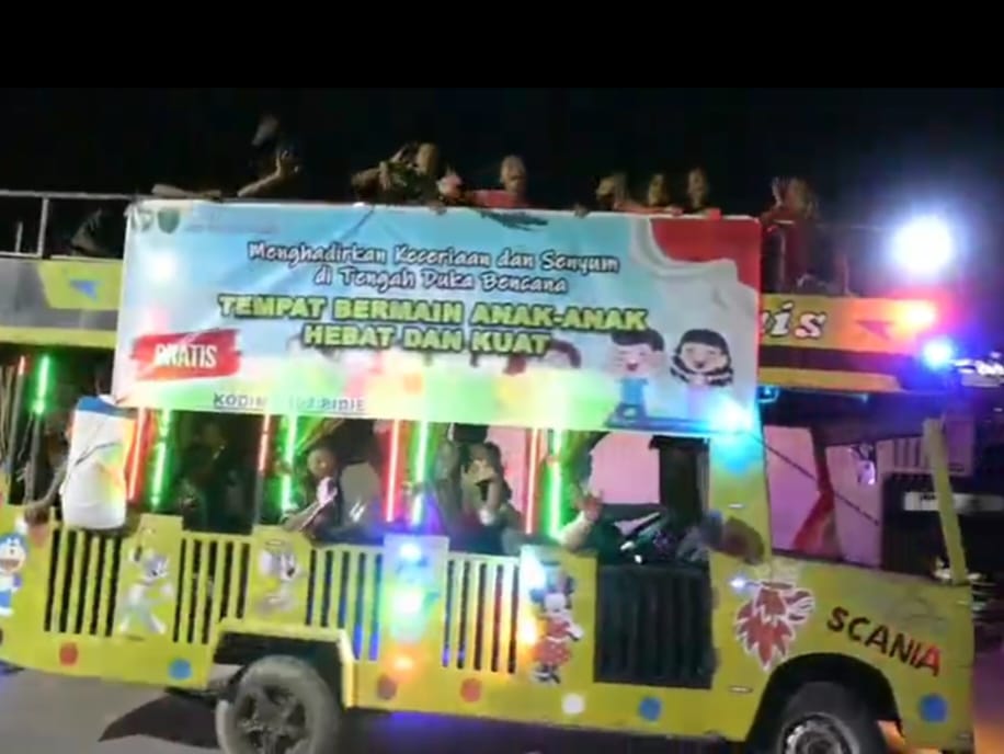 Pidie Jaya – Di tengah suasana duka dan keprihatinan akibat bencana banjir dan longsor yang melanda sejumlah wilayah di Kabupaten Pidie Jaya, secercah kebahagiaan hadir bagi anak-anak di lokasi pengungsian. Kodim 0102/Pidie menghadirkan wahana permainan odong-odong gratis sebagai bentuk kepedulian dan upaya pemulihan trauma (trauma healing) bagi anak-anak korban bencana.Sabtu (27/12/2025) malam